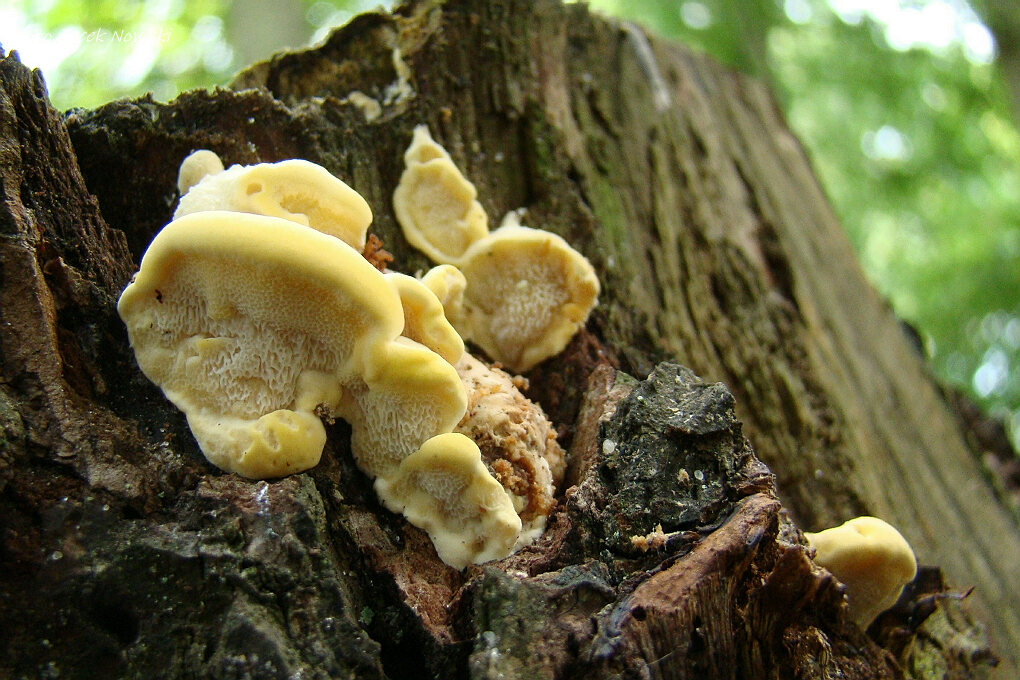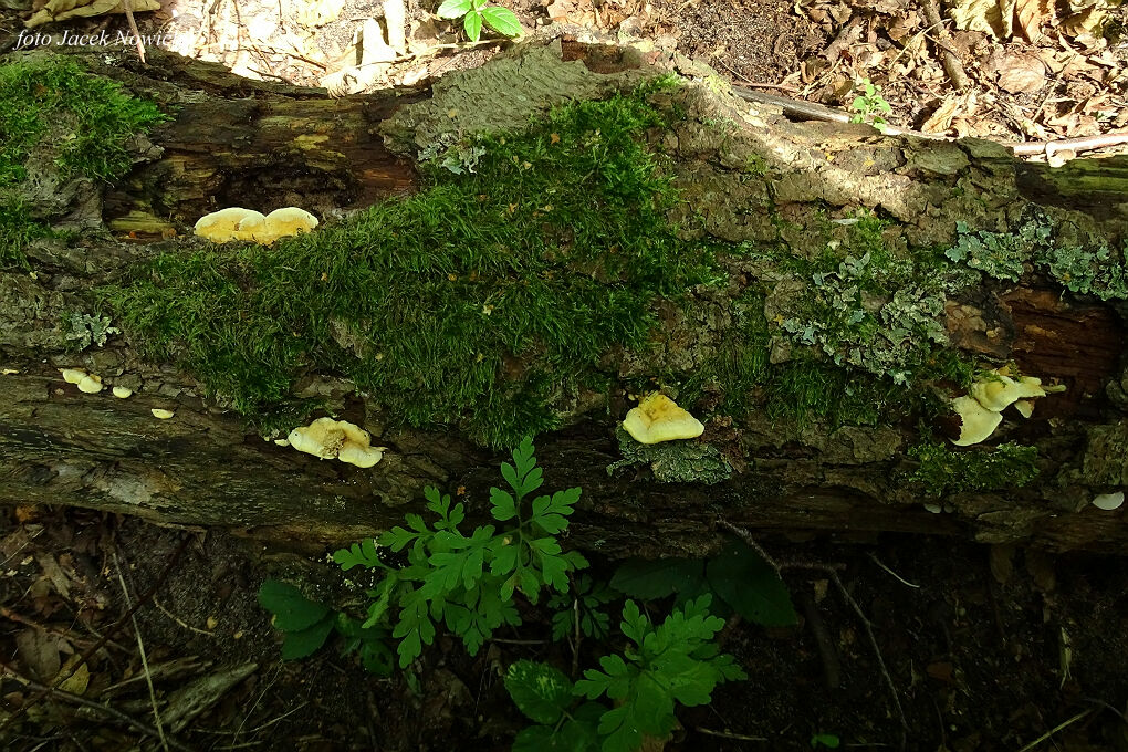 28.06.2015 Olchowiec - Kuri Wierch. Na zmurszałej, bukowej kłodzie, na starych owocnikach błyskoporka rozpostartego.